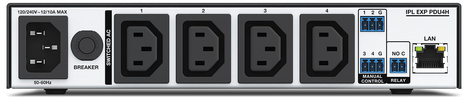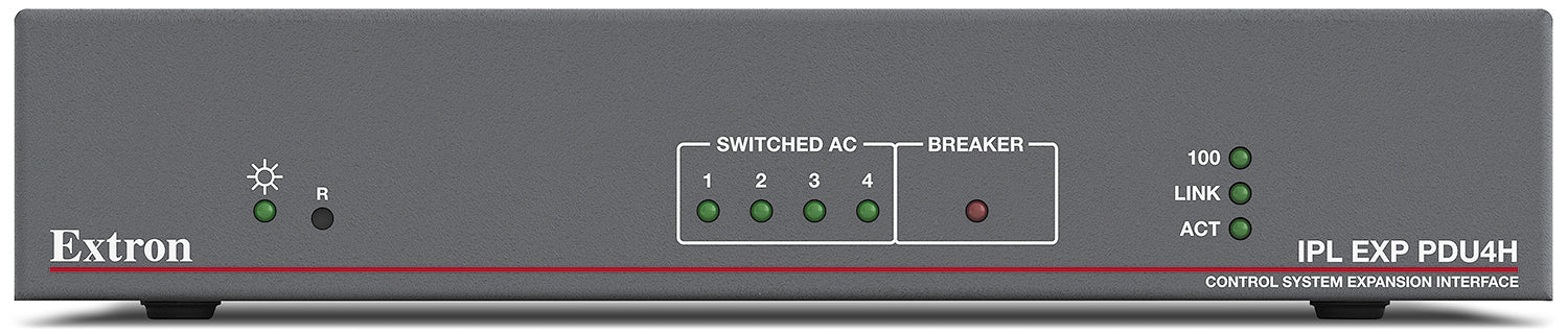 The Extron IPL EXP PDU4H is a control system power expansion interface that provides centralized power management for small to medium sized AV systems. It delivers the ability to control individual AC outputs remotely, and allows for aggregate current sensing. The IPL EXP PDU4H is Ethernet enabled and features four AC outputs, four override input ports, and a relay for additional system support. It is designed to be used with an IPCP Pro xi Series control processor for secure, encrypted power control of attached devices. It can also operate independently using a secure Extron API, enabling seamless integration for specialized applications. The IPL EXP PDU4H is housed in a compact 1U half rack enclosure that offers a broad variety of mounting options.