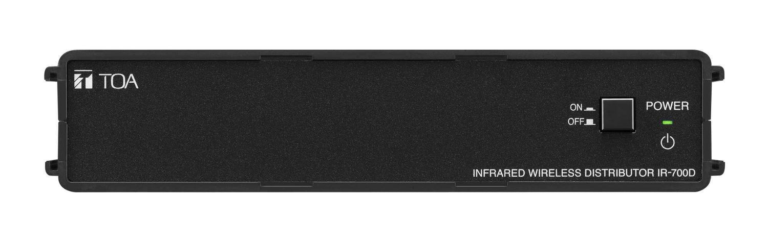 The TOA IR-700D Infrared Wireless Distributor is intended for use with the TOA Infrared (IR) Wireless Microphone System. There are 4 BNC inputs for connecting IR520R, 510R and 500R receivers, and up to 16 receivers may be used simultaneously with the optional YW-1022 and YW-1024 branch distributors.