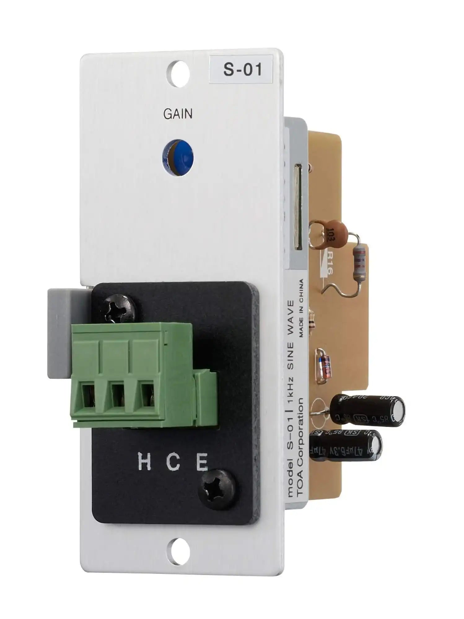 The S-01S is a tone generator module to be used in conjunction with the 900 series components and other TOA's equipment. It has a 1 kHz sine wave test tone generator with removable terminal block connector, and gain control.