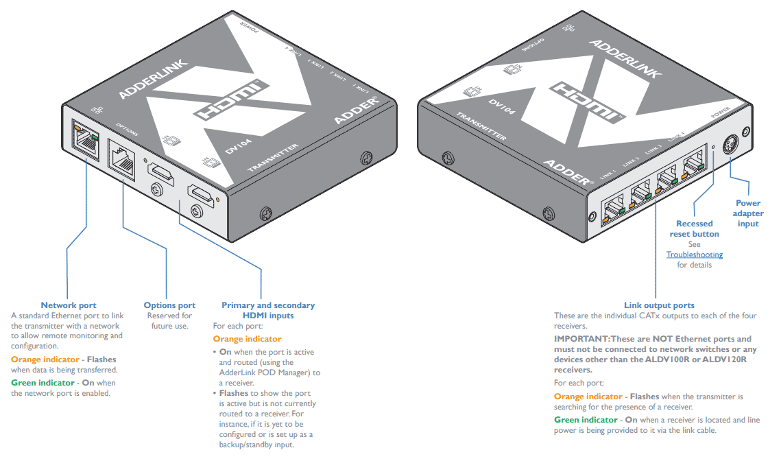 The AdderLink ALDV104T-US is a high-performance HDMI video splitter and extender that enables secure extension and distribution of up to two HDMI sources to four displays over CATx cables up to 50m/164ft, delivering pixel-perfect 1080p or 1920x1200@60Hz video with eight-channel embedded audio and HDCP support. Key benefits include source failover for uninterrupted operation by automatically switching to a secondary input if the primary fails, proof-of-display via IP for remote diagnostics and content management integration, and energy-efficient line-powering that eliminates external PSUs for receivers—enhancing reliability and simplifying deployments in high-stakes environments.