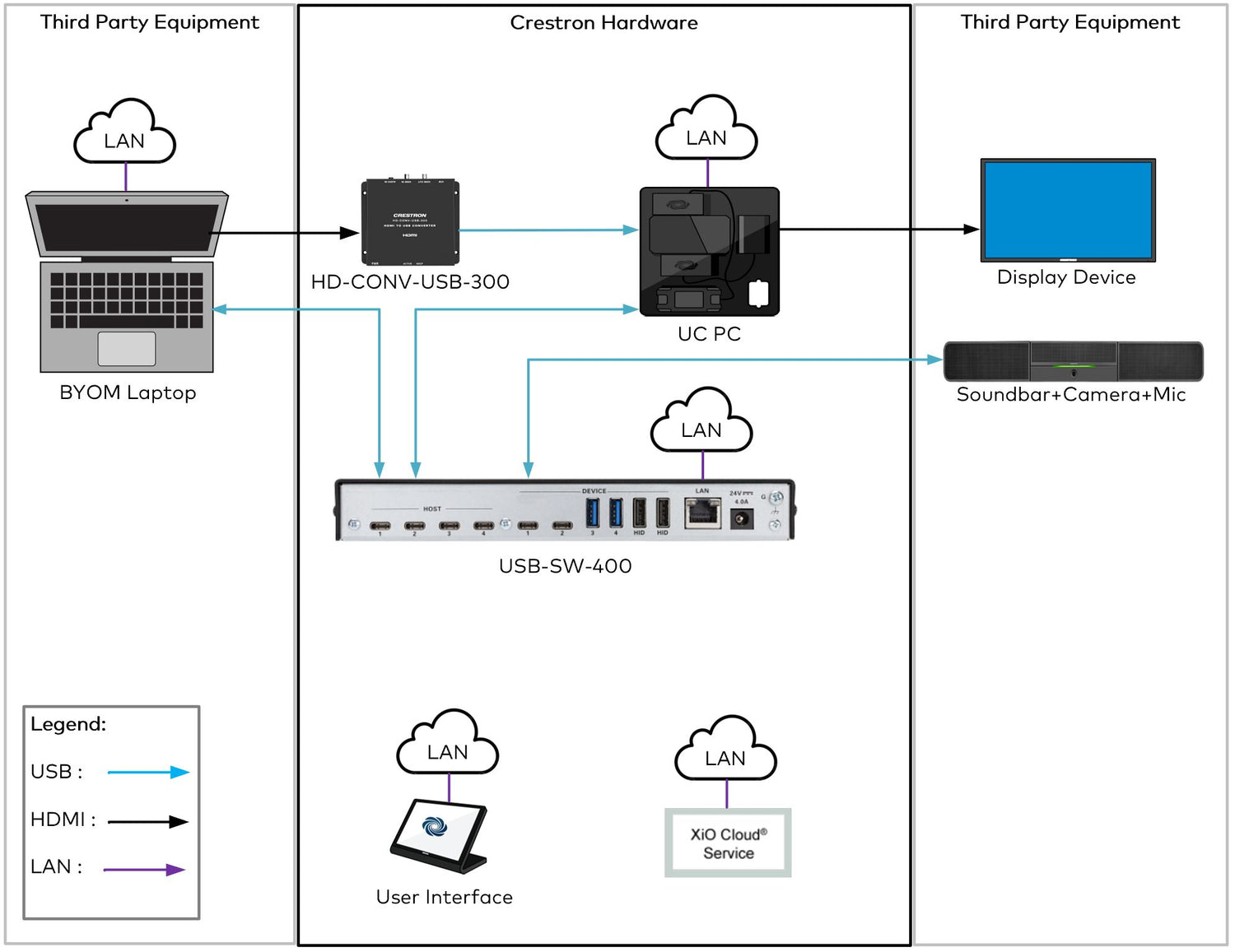 Automatic switching among the USB ports can occur based on the last connected device or on the routing priority assigned to each port. Switching behavior is configurable using the web interface or the XiO Cloud® service and is programmable using a Crestron control system.