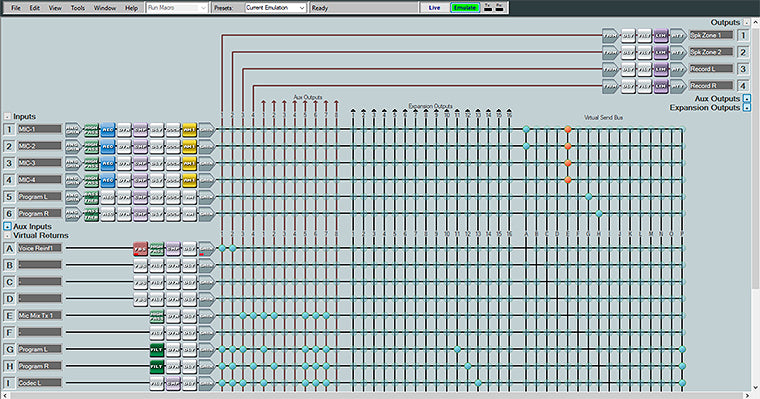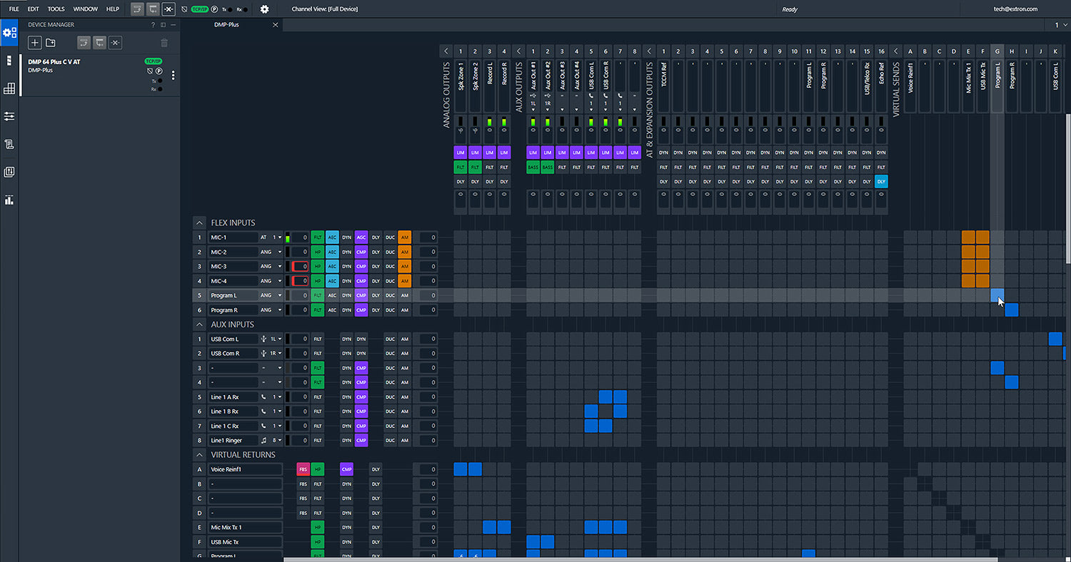 - Intuitive Graphical User Environment — The DSP Configurator Software features a Graphical User Environment that offers a clear view of all inputs and outputs, audio processing blocks, routing, mix points, and virtual routing in a single window. This allows a designer or installer to quickly view an audio configuration without having to access multiple windows or menus.