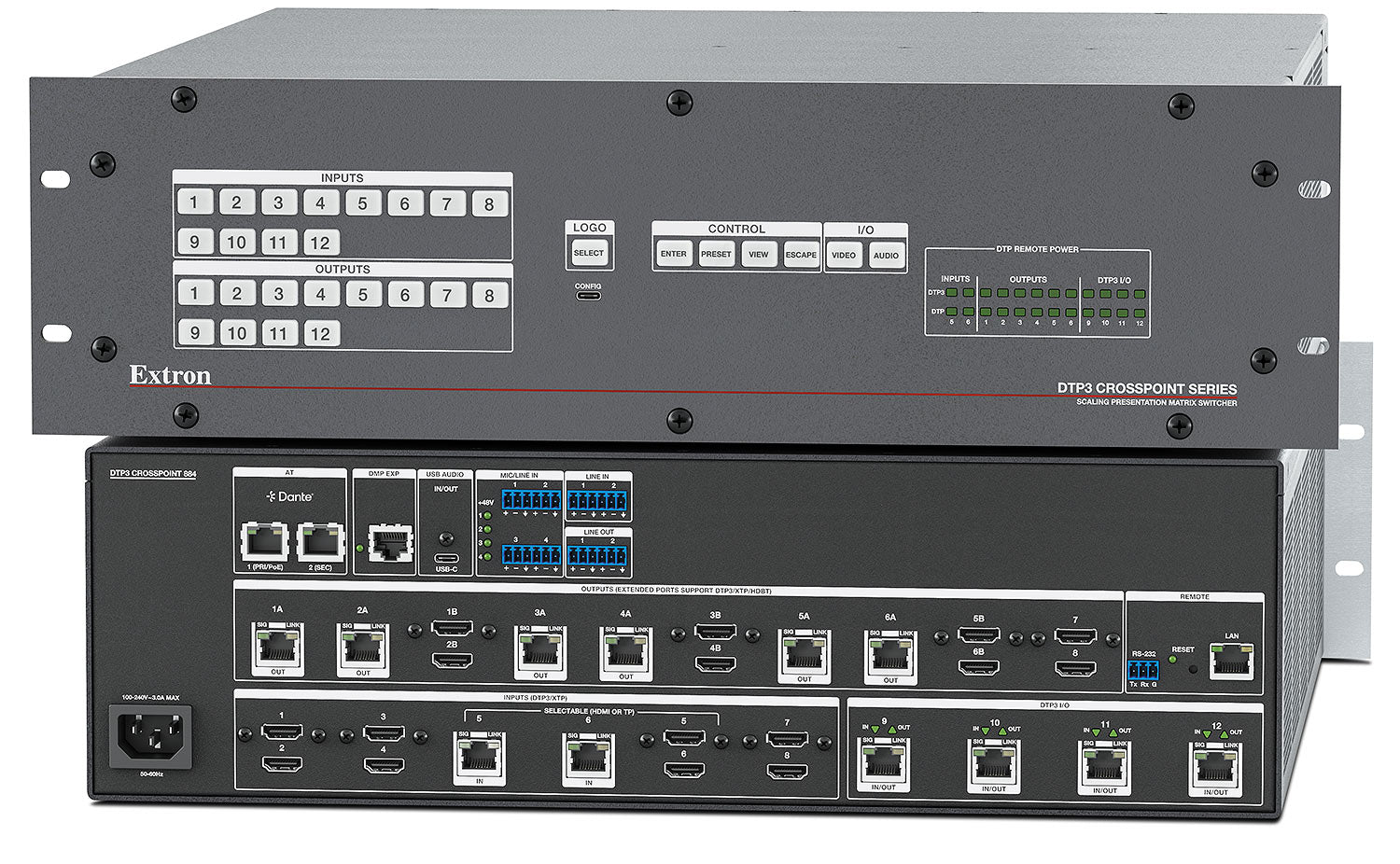 - Integrated DTP3 inputs and outputs support transmission of uncompressed video, audio, power, and control up to 330' (100 m) over a shielded CAT 6A cable — DTP3 inputs and outputs support digital transmission of uncompressed video, audio, DC power, and RS‑232 signals up to 330 feet (100 m) over a shielded CAT 6A cable, providing high reliability and ultimate performance on an easily installed cable infrastructure.