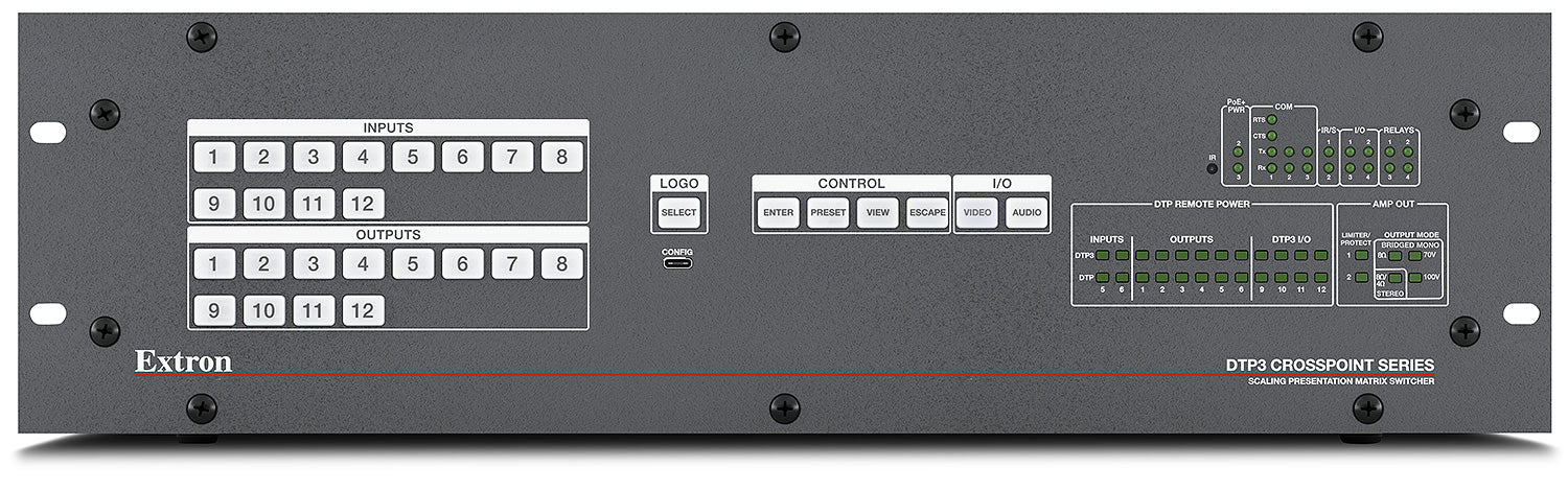 - All‑in‑one configurable 4K/60 matrix switcher, scaler, audio DSP with AEC, audio power amplifier, and control processor — The DTP3 CrossPoint 884 delivers all of the core functionality of a large AV system. Advanced technological capabilities from Extron allow complete system design and integration from a single 3U device.