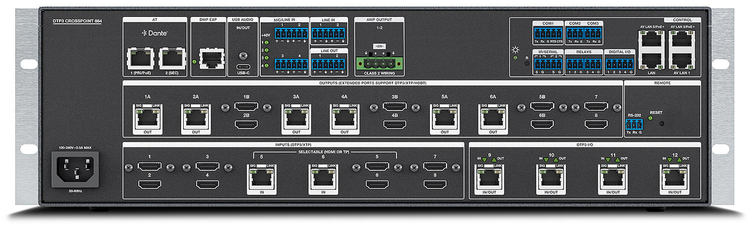 - Four reversible DTP3 I/O: Selectable in any combination of inputs and/or outputs — 14 additional matrix switching configurations beyond the dedicated 8x8 inputs and outputs are possible using these ports - from 8x12 to 12x8. Port assignment can be managed via PCS and SIS commands.