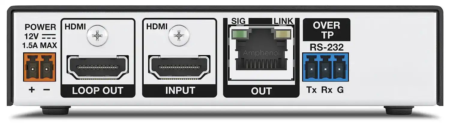 - Bidirectional RS‑232 pass-through for AV device control — Bidirectional RS‑232 control signals can be transmitted alongside the video signal, allowing remote AV devices to be controlled without the need for additional cabling.