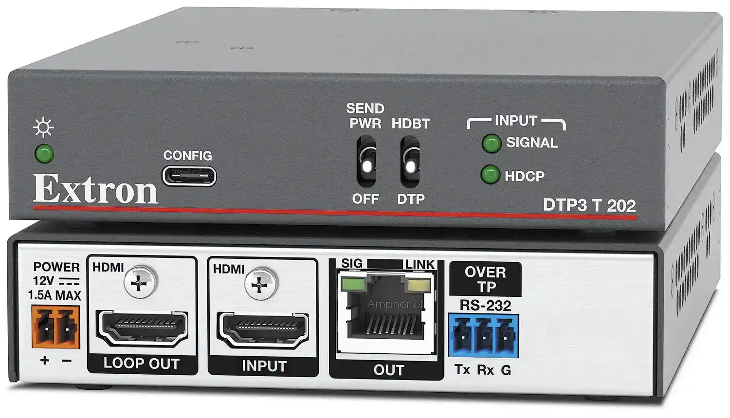 Bidirectional RS-232 control signals can be transmitted alongside the video signal, facilitating remote operation of AV devices without the need for additional cabling. For added convenience, a USB-C configuration port on the front panel offers ready access to information and easy updating of firmware. Configuration of the DTP3 T 202 is made simple with Extron’s PCS - Product Configuration Software and its user-friendly GUI that is very easy to navigate. This software application allows for expedited setup, commissioning, real-time operation and monitoring.