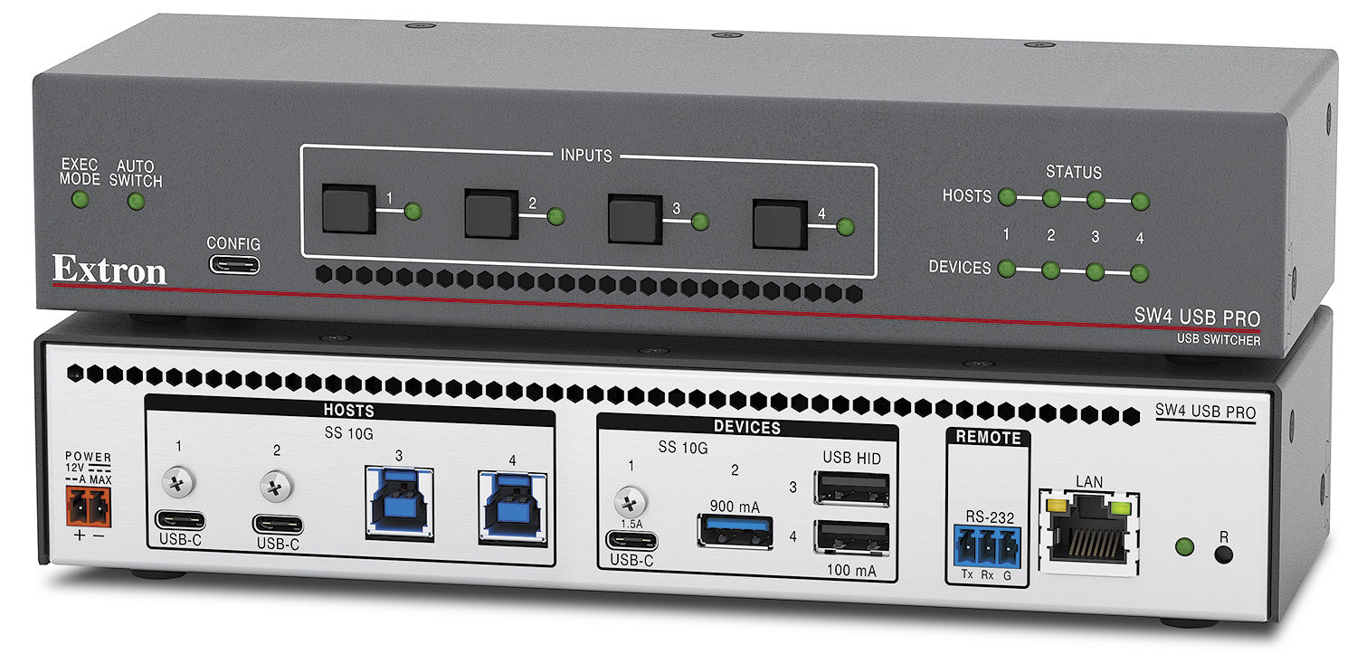 The Extron SW2 USB Pro and SW4 USB Pro are two- and four-input USB switchers that facilitate USB 3 compatible switching between multiple host devices and multiple USB peripherals. They provide integrator-friendly solutions for USB‑C and Thunderbolt hosts and peripherals with data rates up to USB 10Gbps. HID peripheral ports support hotkey input switching via a connected keyboard. SW USB Pro switchers also support auto and manual host and peripheral switching and control via RS‑232 or Ethernet. They feature Host and Peripheral Emulation Mode, which provides "keep alive" functionality by continuously mimicking host and keyboard/mouse communications within the switcher. This emulation eliminates the need for enumeration and reduces the chance of failed device communications throughout the switching process.