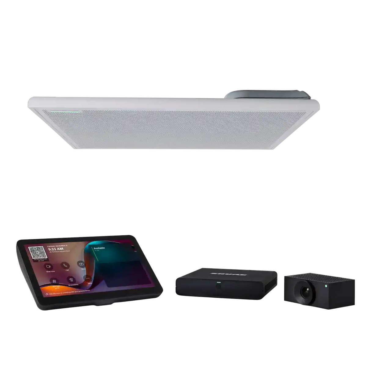 Complete Solution – All components included: compute, audio DSP, ceiling array mic + speaker, AI-powered camera, and touch panel.